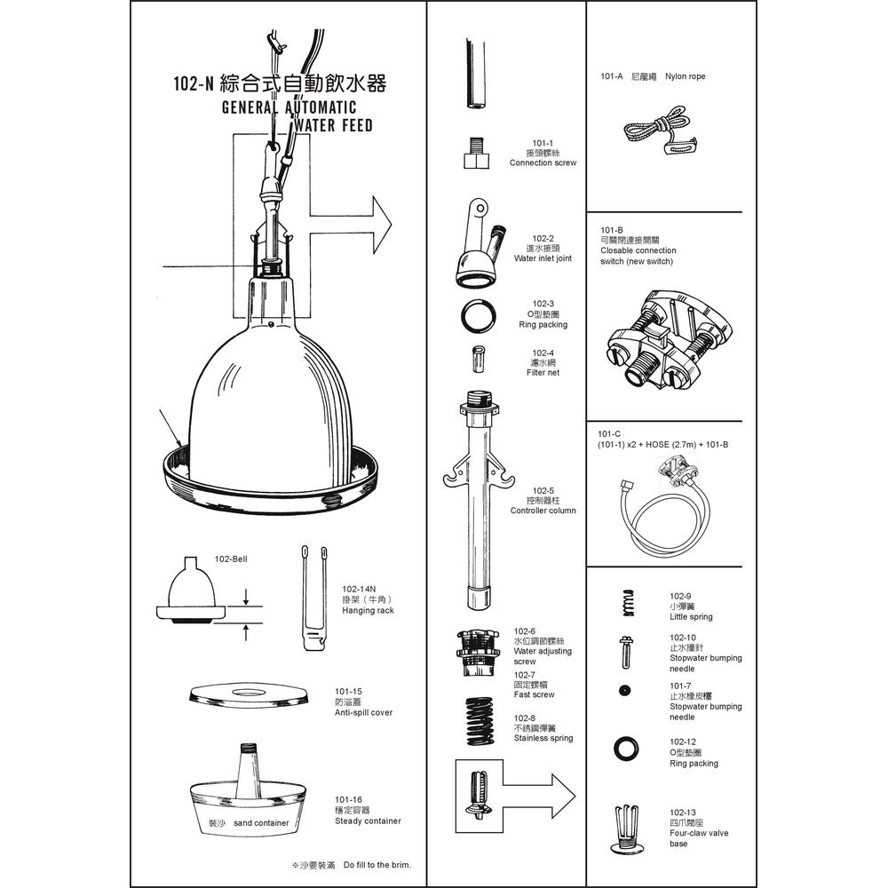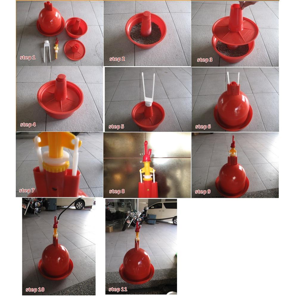 Big suspension waterer working on the ballasting principle. As water is taken, the load lightens and the valve system lets water in again. This waterer is ideal for up to 300 chicks, or 150 layers, or as a home-breeder waterer. 10mm water connection. Adjustable water level. Dish diameter is 37cm and height is 55cm overall. Working pressure from 0.2 to 0.5 bar (3 to 8 psi).